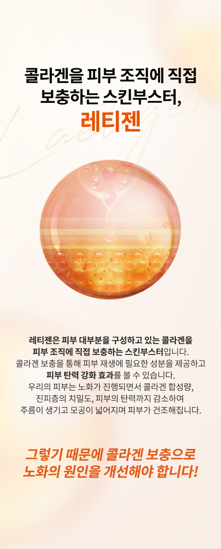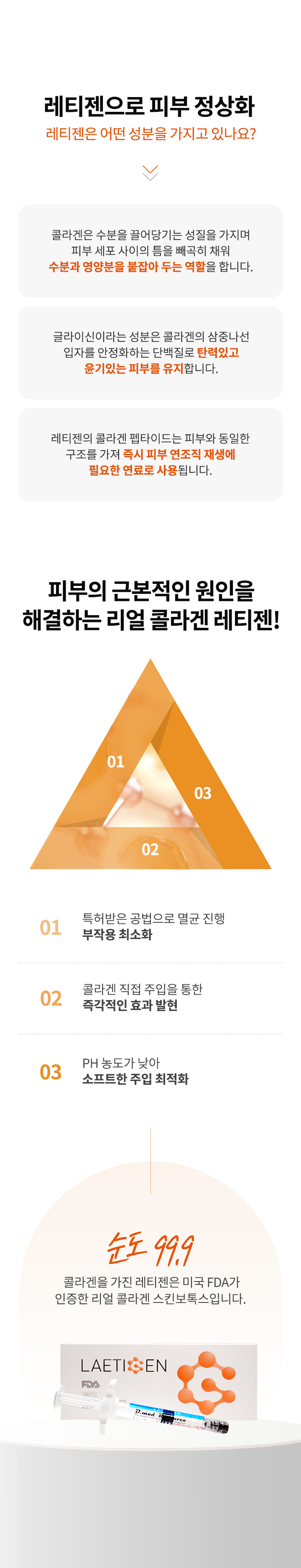 이번에 FDA 승인을 받아 신규런칭한 "레티젠"은 진피층에 큰 역할을 담당하는 Type 1 콜라겐(99.9%)을 피부에 직접 주사,